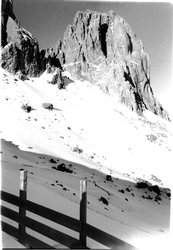 L'idea era quella di comporre sfruttando le linee diagonali (lo steccato, le zone di ombra e di luce, la base del Sassolungo) differenziando i piani.