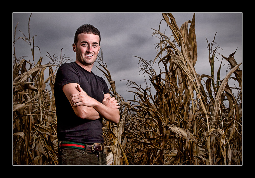 Flash diffusso con ombrello traslucido sulla destra, sfondo sotto-esposto di ca. -3 stops, pw per ottenere un look tipo Devid Hill