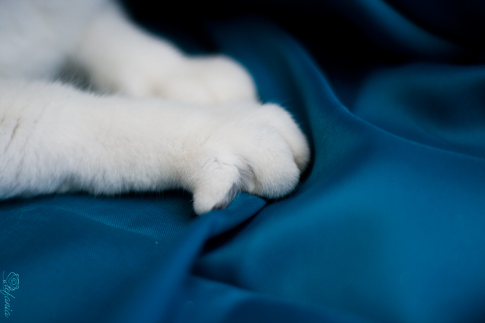Molto bella... soprattutto per alcune cose che la "sbilanciano", come la differenza di sfocato tra sinistra e destra legata al pelo del gatto da un lato e alla stoffa dall'altro, oppure il dito della zampa "fuori posto" che stuzzica l'occhio... Forse da tagliare un po' in basso e provare con un campo leggermente più esteso per allargare un po' la pdc su tutta la zampa in primo piano.
