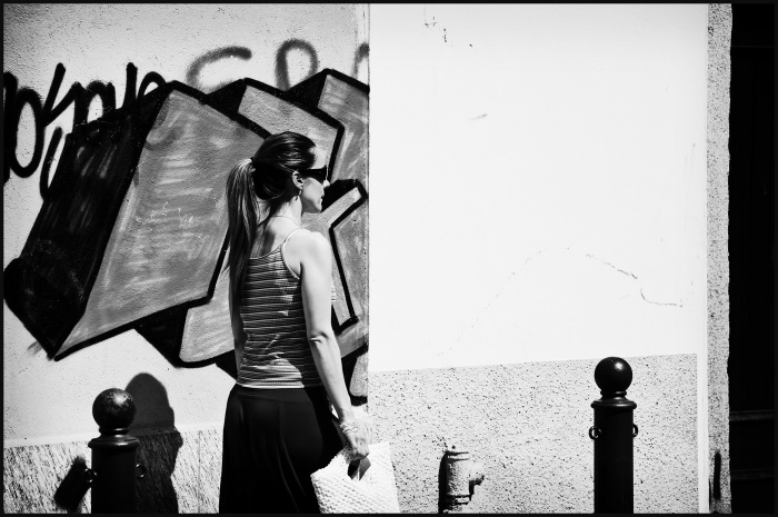 Personalmente avrei ripreso la passante (che ti ha tradito perchè la borsa và nell'altra metà) molto più a destra, uscente dal fotogramma e tagliata dal margine laterale. Ottenvi così un mezzo murale, e una mezza figura umana, che poteva raffrozare l'idea di due fotogrammi affiancati.