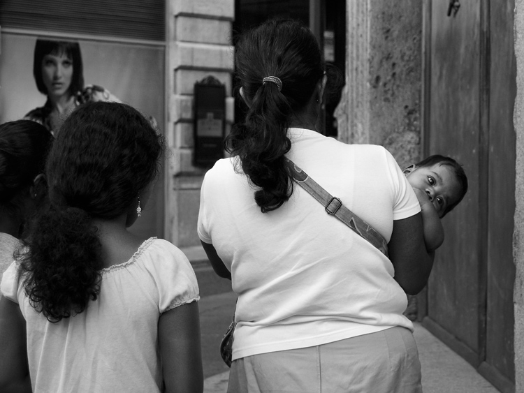 Efficaci i due sguardi, quello della bimba e quello della ragazza del cartellone, diretti quasi nella stessa direzione, indietro, alle tre donne..