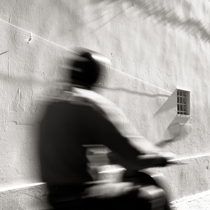 La tua serie gallipolina mi convince tutta, si intuisce un filo logico; ma mi soffermo su questa, che foto mossa non è, per un particolare che non riesco a decidere se funziona o meno: ed è quella linea diagonale che taglia la testa dello scooterista per andare a morire contro lo stipite della finestra.