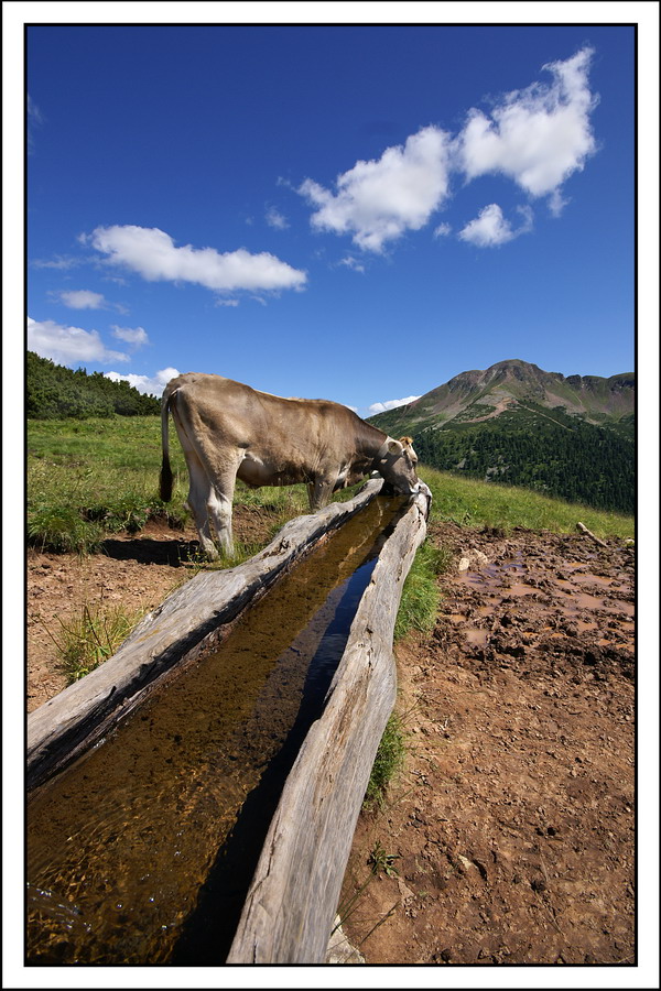 Ho avuto la fortuna di trovare una giornata limpidissima, e in alta montagna questo vuol dire colori e luci molto accesi, è per questo che l'mmagine appare molto vivace dal punto di vista cromatico, il grandangolo poi mi ha permesso di giocare con la prospettiva ed allungare la vasca con l'acqua creando una diagonale che dirige lo sguardo verso la vacca assetata.