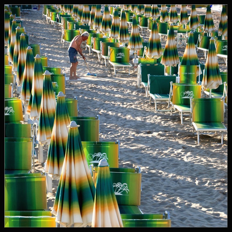 bellissimo gioco di cromatisimi e geometrie. La presenza umana nel punto giusto. Ottima anche la scelta del taglio quadrato. Avrei tagliato un pò in alto per non mostrare la fine del corridoio tra le file di ombrelloni. Resta un ottimo colpo d'occhio!