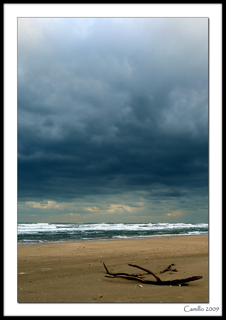 Composizione classica, legno a relitto in pp, striscia di mare e cielo tempestoso.