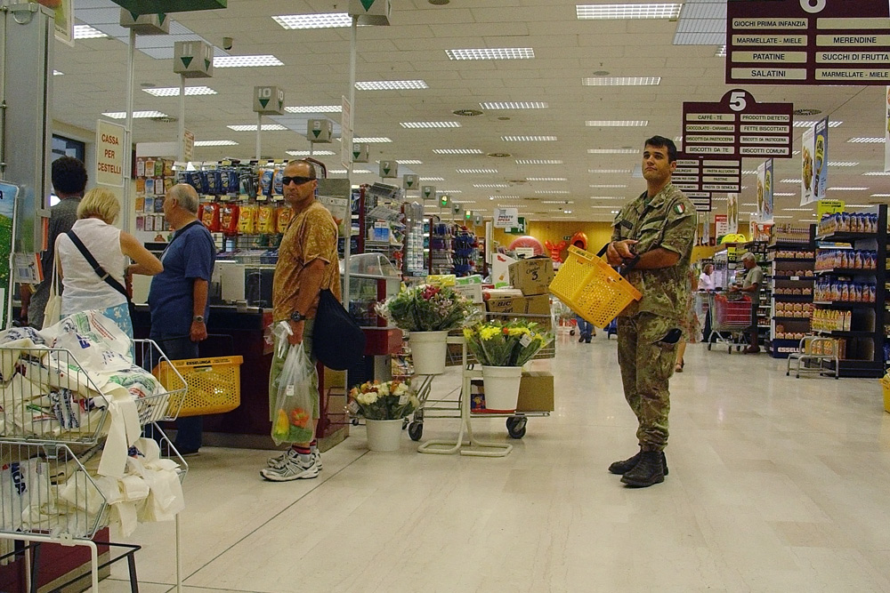 sono contento per te, perchè non ti ha ancora fermato la vigilanza in un supermercato o in un centro commerciale. Questi posti pullulano di scatti fantastici come questo Ormai io sono inibito fino al midollo tanto che mia moglie prima di entrare in un centro commeriale si rassicura con me di non aver portato la macchina fotografica per evitare lunghe discussioni e perdite di tempo. Composizione buona grazie all'utilizzo di una giusta focale che posiziona i personaggi senza grandi sovrapposizioni. Il soldato in divisa mimetica e anfibi, con il basco nella tasca laterale dei pantaloni è davvero un'ottima preda, fermato in un espressione annoiata, con il frivolo cestino della spesa quasi vuoto; il tutto si contrappone alla normalità dei personaggi e del contesto ottimamente ripreso. Avrei preferito che il tizio davanti al militare non guardasse in camera anche se gli occhiali scuri ti hanno un pò salvato.