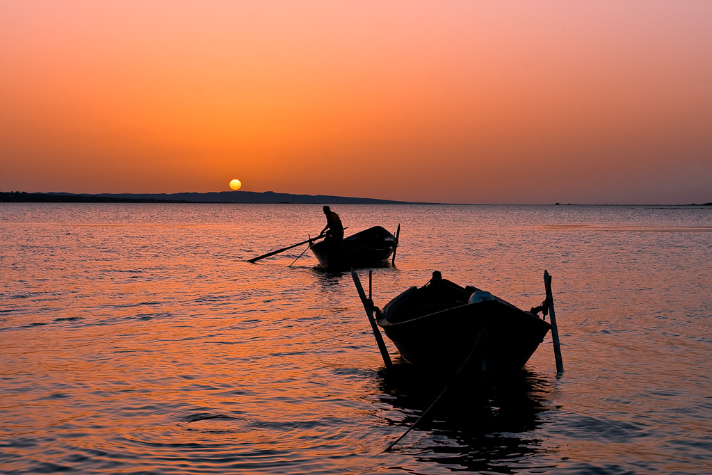 Decisamente molto bella con quel colore straordinario del cielo e dell'acqua com le sagome nere delle barche e del barcaiolo. Due punti forse ancora perfettibili: la linea di orizzonte (visibile a destra) dà l'impressione di non essere perfettamente orizzontale, converrebbe dare una controllate e, se del caso, una raddrizzata (forse mi sbaglio); tagliare via in alto in po' di cielo, circa un terzo - un quarto dell'attuale.