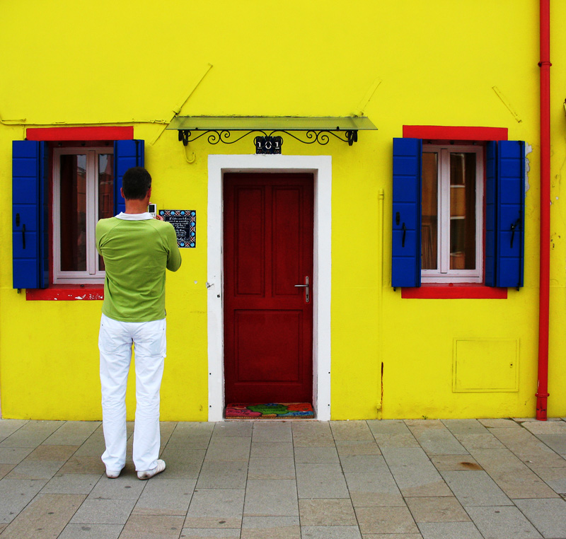Interessante, piacevole, colpisce immediatamente sia per i colori che per l'azione dell'uomo, che tra una miriade di colori viene catturato da una targa in bianconero...avevi notato il colore della maglia uguale alla tettoia sopra la porta?