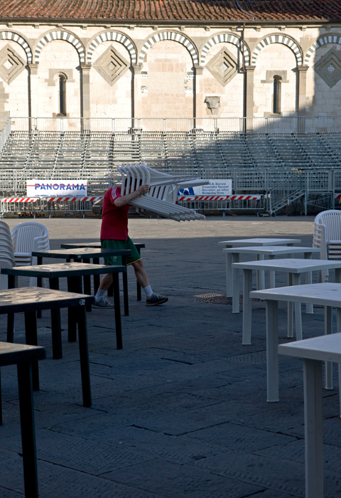 Anch'io non so molto di street, quindi pinze - ma più che incentrata sulla situazione, mi sembra una ricerca su ritmo e scansione alternata: linee dei tavoli (neri/bianchi), linee di nastro e maglia (rosso/bianco), le sedie impilate, le file dei palchi, le pietre delle lunette sulla chiesa...vedo ora anche il richiamo dei rombi tavoli/selciato/sottolunetta.