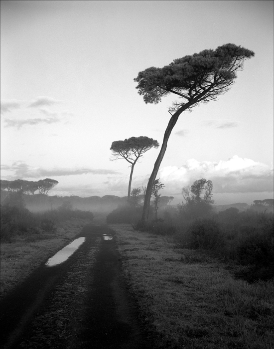 I toni del bn, la bruma, l'immobilità degli alberi che sembrano in attesa