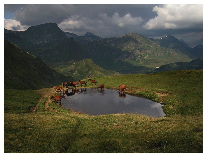 Lo spot creato (correggimi se sbaglio) ad hoc attorno al bacino d'acqua, come una luce da palcoscenico per i soggetti prim'attori, lo avrei esteso a tutta la parte alpina ancora illuminata seppur tenuamente, dal sole....come per dare una specie di via di fuga al giorno che sta scemando.... |