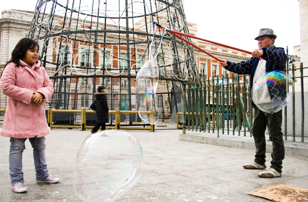 Sarebbe stato interessante se fossi riuscito a cogliere una perfetta sovrapposizione della passante dietro sulla bolla in basso. La sua presenza poteva essere quasi quella di un folletto, un aiutante dell'uomo che plasma l'acqua e il sapone, capace di destare la vera meraviglia della bambina (che guarda in quella direzione ed indirizza quindi pure lo sguardo dello spettatore). Così com'è risulta per essere una comparsa " scomoda". Forse meglio metterla in sordina, sperando che il nero del cappotto la inghiotti in seguito ad una conversione in B/N ( a discapito dei riflessi colorati delle bolle)