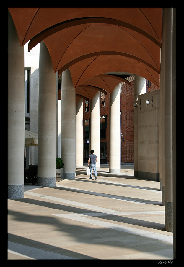 Piacevole il contrasto tra i colori delle volte e delle colonne. L'ombra irregolare in basso toglie geometria allo scatto, ma non lo trovo un difetto. Le altre ombre, diritte, si sovrappongono alle linee del pavimento, oblique. E' un mix di perfezione e imperfezione in cui si trova immerso l'uomo, rappresentato dal ragazzo.