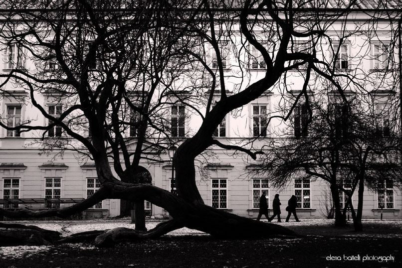 Tutta la fotografia è centrata sull'effetto di trasformazione e reinterpretazione dello scenario urbano. La polarita cromatica di chiaro scuro, unita all'ottimo bianco e nero, scandisce i piani di lettura del fotogramma, le dona profondità e riesce ad incorniciare un piccolo gruppo di persone, congelate perfettamente in una posizione di massima estensione di passo, ben staccate dallo sfondo chiaro del palazzo. Ottima la composizione che riempie armoniosamente tutto il fotogramma orizzontale. La tua firma nell'angolo in basso a destra rappresenta l'unica nota stonata del piccolo quadro.