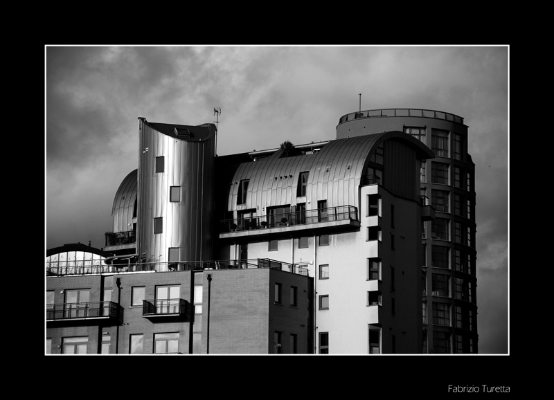 Una fotografia che cattura prima che per la sua bella rappresentazione di forme architettoniche, per la particolarità del bianco e nero che rende la materia molto metallica e cromata. L'incidenza della luce riflessa poi è ben dosata senza bruciature di sorta. Anche il cielo, piombato, si rapporta con equilibrio alla matrice visiva dell'immagine.