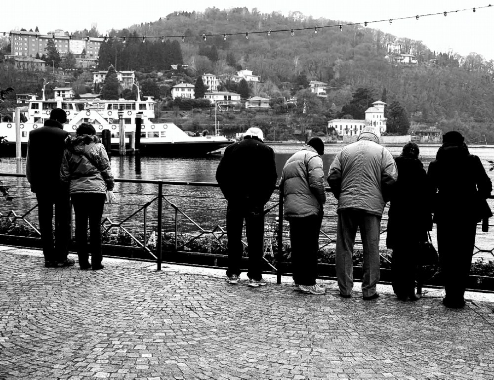 | Questa foto la siego in questo modo , divisa in 2 blocchi traghetto con coppia k osserve triste la partenza di qualcuno, e secondo blocco , gruppo di persone che sono troppo impegnate a osservare i "pesci" per capire la sofferenza dele altre 2 persone . |