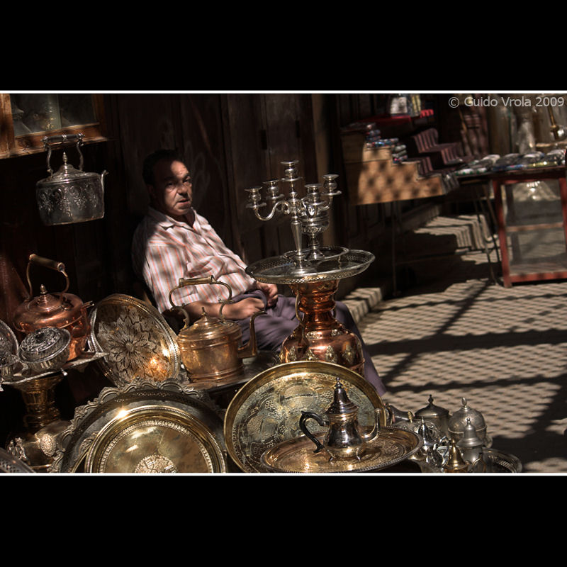 | Un'immagine ricca d'atmosfera: è il gran pregio di questo scatto. Le ombre sono "sapienti" e la ricchezza del vasellame, nitidamente espressa e coloristicamente pregevole, equlibra uno sfondo bastevolmente indistinto e tonalmente celato. Il taglio in luce del viso del venditore rivela una maschera espressiva di pesanti umori e cercati talenti. Notevole. |