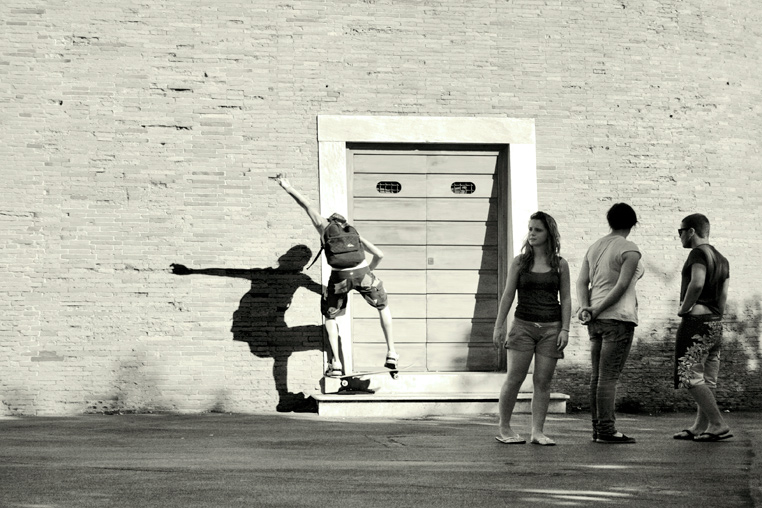 L' inquadratura leggermente sbilanciata a destra ci presenta le acrobazie di un giovane alla prese con lo street-skating. In realtà la vera protagonista è la sua ombra che garegia insieme a lui nel tricks classico sopra lo scalino della porta. Sono presenti alcuni spettatori ma la loro attenzione non è univoca, guidando anche l'osservatore fuori del centro di attenzione: lo sguardo della ragazza in pantaloni corti è piuttosto forte e tende ad diminuire l'intensità del gesto. E' presente una sovraesposizione della cornice della porta.