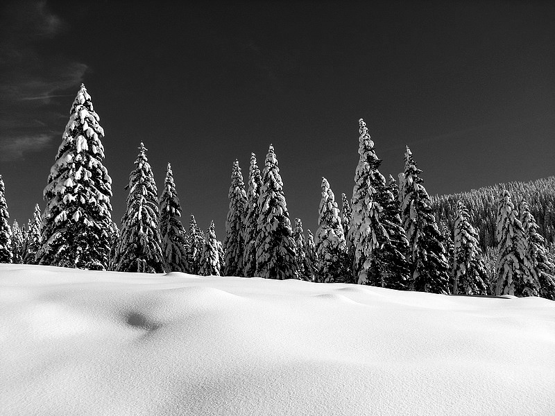 E' notevole il modo in cui gli abeti innevati spiccano contro l'azzurro del cielo polarizzato che qui nel bianco e nero si fa di un grigio intenso e graduato, profondo. Un bianco e nero di alta qualità dunque. La luce sugli alberi è colta al meglio, tanto da farci sentire lì, sul posto.