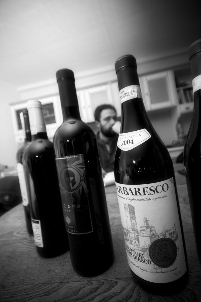 Per cui opterei per una messa a fuoco sul soggetto lasciando sfocate le bottiglie oppure una maf sullo stesso piano all'intera collezione in "par condicio"...