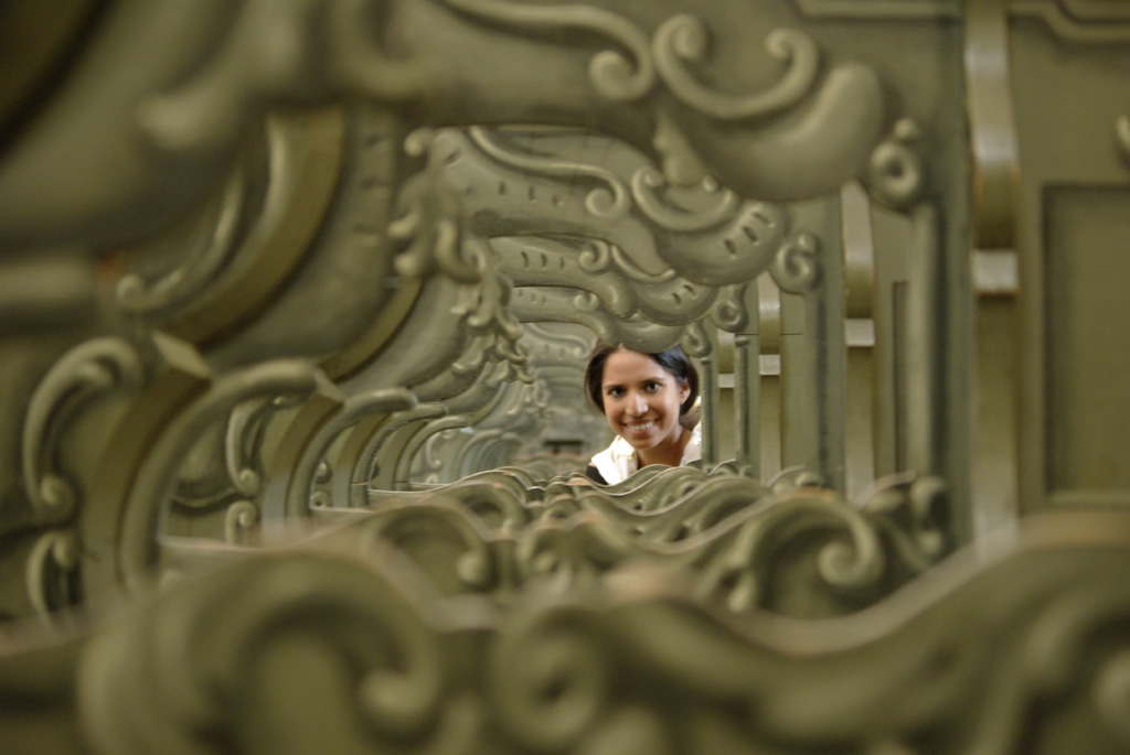 Un viso che sorride. Come avvolto in una morbida "placenta architettonica", vista la conformazione reiterata di forme a lamelle assunta dalla ripresa della struttura con questa apertura estesa di diaframma e messa a fuoco selettiva.