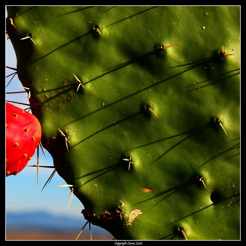 Ti dirò che l'immagine non mi dispiace affatto.. Sono attratto dalle forti cromie della foglia (verde) e del frutto (rosso) interrotte per un attimo dall'azzurro del mare, il tutto sottolineato con un forte sole al tramonto con ombre laterali.