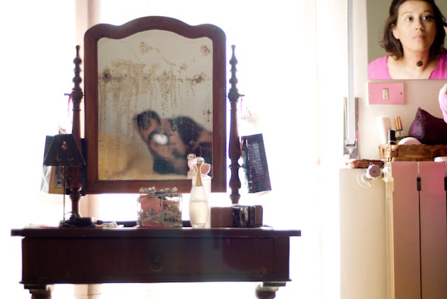 Forse volevi stupire con l'utilizzo della luce sullo sfondo ma in realtà non si capisce. Troppi elementi concorrono a confondere le idee. Forse bastava un taglio mirato sullo specchio, salvando solamente qualche accessorio.