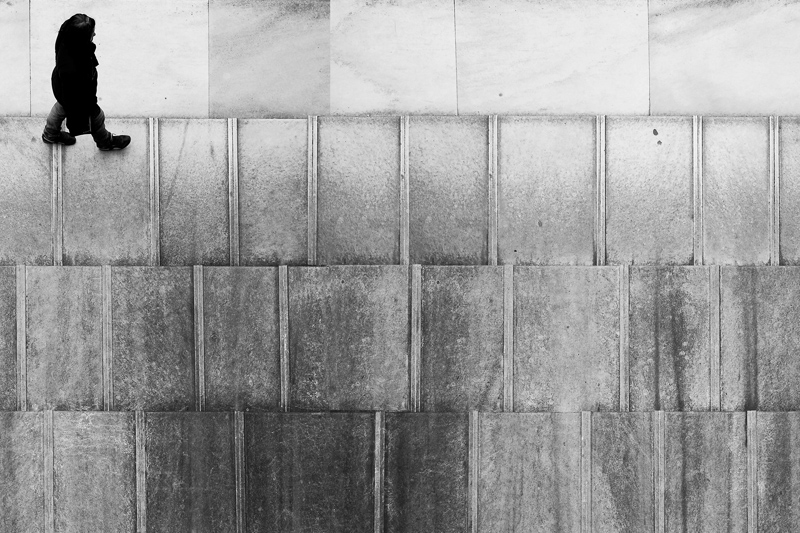 Questa è una delle due foto che ho preferito nella votazione. Inizialmente non riuscivo a capire bene cosa fosse, sembrava una scalinata molto strana, poi ho capito che si trattava solo della pavimentazione ma l'idea di una persona che sta percorrendo una discesa mi è rimasta. Proprio per questo non l'ho reputata banale (come potrebbe essere la semplice ripresa di una scena dall'alto) ma una foto che rende perfettamente l'idea di un movimento dall'alto verso il basso: ho la sensazione che la persona arriverà nell'angolo in basso a destra dopo essere andata a destra, poi a sinistra nella seconda riga e poi ancora a destra nell'ultima riga. Il tutto con un punto di vista dall'alto che rimane per me solo secondario (per quanto senza di esso l'effetto sarebbe svanito) pur dando un maggiore senso di profondità. Complimenti  _________________ Nikon F (di mio padre) con Nikkor-HC 50mm f2, Nikkor-NC 24mm f2.8 e Nikkor 80-200 f4.5 ----Yashica FX-3 super 2000 con ML 50 mm f1.7, ML 28 mm f2.8 e ML 135c f2.8