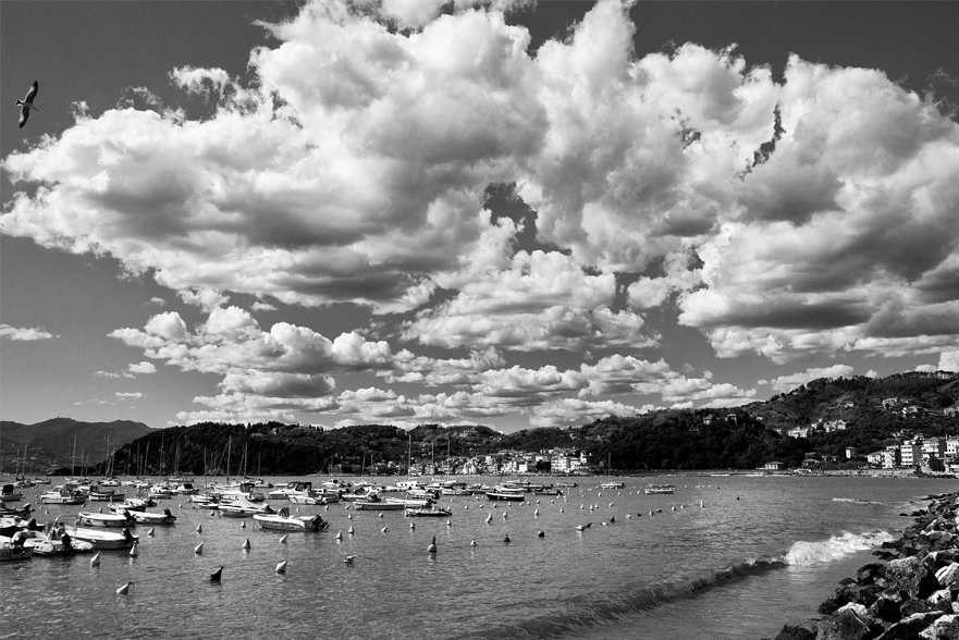 bel B/N... forse da rivedere il taglio.. avrei puntato più su mare+ barche VS. cielo + nuvole...tagliando la scogliera...