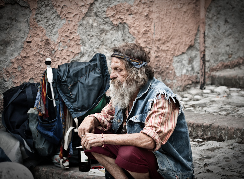 | Colpisce positivamente la somiglianza di quel viso vissuto, con le sue rughe e il suo carnato, con il muro frastagliato e irregolare dello sfondo. Mi sarebbe piaciuto vedere gli occhi di questo caratteristico personaggio, entrare in contatto con lui e dargli del "tu". La sua posizione è troppo centrale. Un'inquadratura spostata verso sinistra avrebbe decentrato meglio il soggetto ed eliminato la parte vuota del fotogramma a destra. |