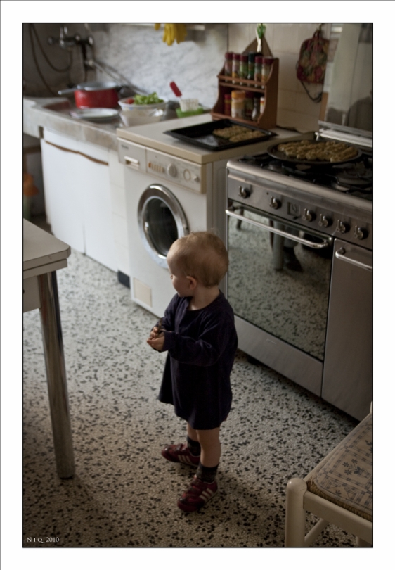 Nonostante in questo scatto ci siano tutti gli errori che si possono fare nel ritrarre bambini (altezza, sfocato, mosso, sguardo...), la foto mi comunica un certo senso di inquietudine forse dovuto al senso di impotenza del bambino in mezzo alle cose "da grandi".