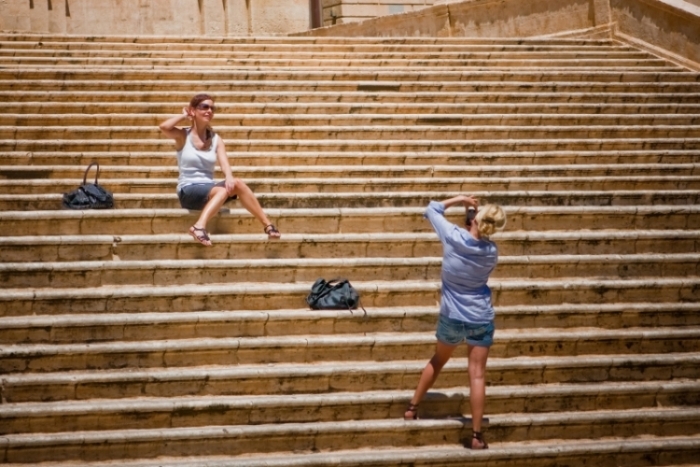 La composizione non è stata affatto curata come in quelle di Dave Hill, è uno scatto che ho "rubato" a due turiste mentre si fotografavano sulle scalinate del duomo di Noto. Ho cercato di ricreare solo l'effetto "fumettistico" che Hill dà alle sue foto.