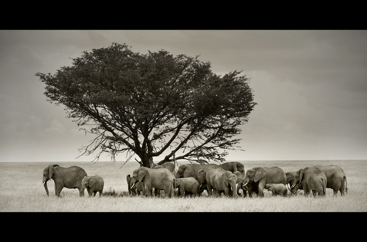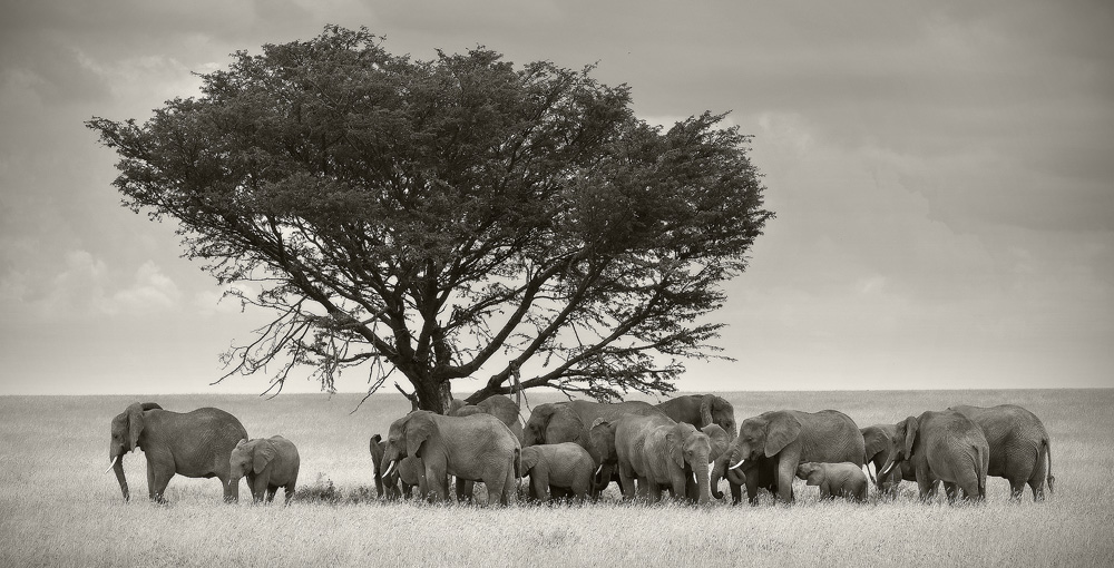 La scelta del bianco e nero, con questi grigi controllatissimi, è intelligente per me, data la giornata che tu stesso hai incontrato; la mancanza delle tinte usuali calde africane concentra la nostra attenzione sui profili e sulla intimità della scena naturalistica.