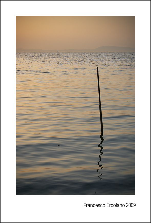 Un solo palo e il suo armonioso riflesso quale centro d'interesse netto e portante,tutt'attorno il silenzio e sul fondo-impercettibili ma così importanti-una vela e il profilo di terre lontane.