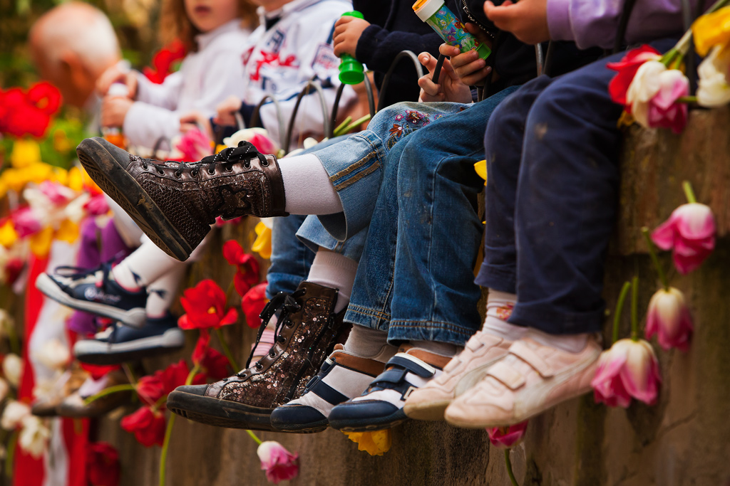 Piena di allegria questa inquadratura ravvicinata della sequenza di piccole gambe e scarpe colorate. La messa a fuoco selettiva sulla gamba ripresa in posizione estesa ci sofferma sui particolari che ci fanno immaginare lo spensierato e gioioso pomeriggio di gioco fra bambini. La scarpe sporche di terra, l'orlo dei pantaloni ripiegato amorevolmente in alto da un genitore lungimirante, quelle bottigliette di bolle di sapone, riportano metionicamente al giorno di festa vissuto, ai colori degli addobbi del luogo e alla leggerezza dell'infanzia. In lontananza una figura matura a vegliare su di loro.. Forse una maggiore profondità di campo avrebbe evitato quello sfuocato nel primissimo piano a destra che disturba lievemente.