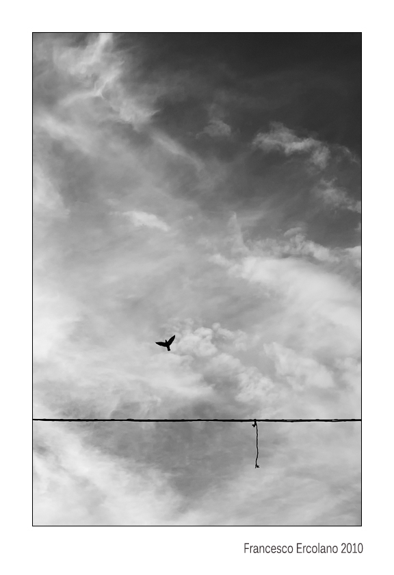 Un bianco e nero a suo modo drammatico, direi decisivo, che lascia intravvedere, in questa impennata, suggestioni dal passato, quasi reminiscenze belliche da vecchio film in BW. Ma colpisce la casualità un po' sfrangiata, quasi sciatta di quel cavo che oscilla in basso mosso dal vento... mentre la perfezione netta di quel volo in alto, quelle ali orgogliose e spalancate, alzano il tono della immagine su altro livello, in un impari raffronto fra silhouettes.
