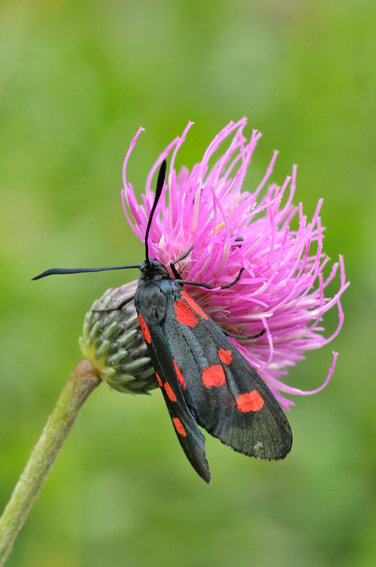 Se noti, le ali delle zigaene sono disposte a piramide e ciò rende più difficile la messa a fuoco contemporaneamente di entrambe.