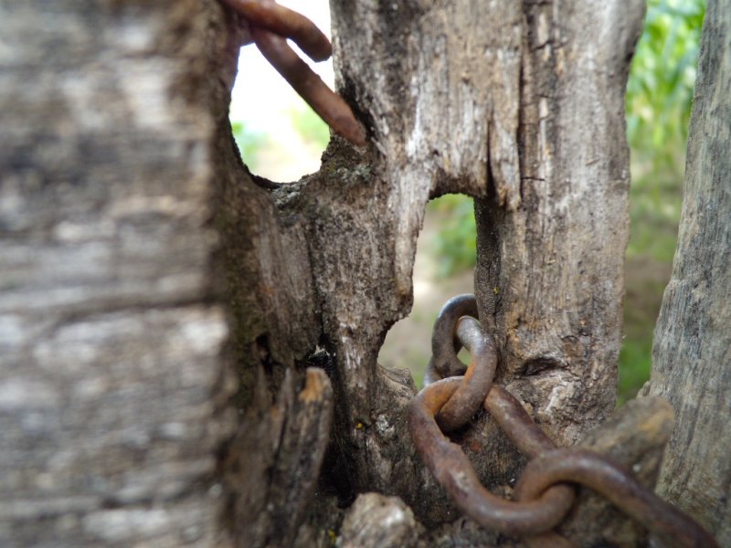 Perchè non un taglio verticale, eliminando tutta la parte di sx la quale nulla aggiunge allo scatto. Una messa a fuoco più precisa agli anelli della catena che appoggiano alla base del foro nell'albero.