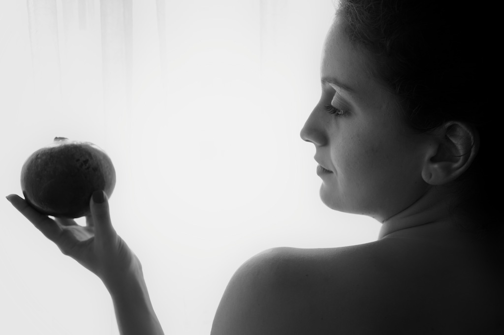 bella e delicata, la spalla doveva essere più bassa per invitare lo sguardo verso la melagrana che doveva però essere a fuoco.