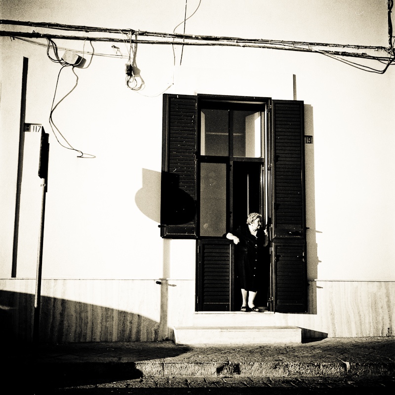 L’istantanea di Nasht rappresenta una figura intera di donna sulla soglia di una casa. L’autore riprende la scena con una focale grandangolare realizzando un campo medio dove la donna e l’ambiente circostante convivono in armonia, dialogando tra loro. L’autore scatta ad altezza occhi, quasi frontalmente all’edificio che accoglie l’entrata dell’abitazione. La luce è alta e crea dei forti contrasti, mettendo in scena delle ombre riflesse. La donna si trova sulla soglia di quella che dovrebbe essere la sua abitazione e viene ripresa con il corpo che si offre allo sguardo dello spettatore ma allo stesso tempo presenta il volto di profilo, con lo sguardo rivolto a destra fuori dell’inquadratura. Sopra della caratteristica porta d’ingresso abitativa è presente uno scompigliato e trasandato intreccio di fili elettrici che attraversa il fotogramma da sinistra verso destra. L’idea del nostro Nasht è quella di presentare uno scorcio urbano di questa Gallipoli, esplicitato nel breve titolo che accompagna l’immagine. Non ci presenta un lembo di spiagge invitanti, o caratteristici panorami marini, ma un’istantanea del cuore della città, non di quella del “ borgo nuovo” , ma di quella della "città vecchia”. Un’immagine emotivamente distaccata, contemplativa, osservatrice. Il surcadrage di quella porta altissima fraziona l’inquadratura e presenta la figura della donna “autoctona” che appare come visivamente trattenuta, in stato di attesa. Vuole essere guardata ma non vuol guardare: questa la modalizzazione del suo “guardare” secondo il volere. È in attesa sopra i gradini della sua soglia, in ciabatte casalinghe, appoggiata con il braccio destro: offre il suo corpo allo sguardo dello spettatore ma guarda altrove, i suoi pensieri sono lontani, creando uno spazio poroso, dilatando l’inquadratura, e rendendola permeabile all’influenza del fuori campo. Una figura autoctona dicevamo, nata e vissuta fra queste vecchie mura che l’accolgono ancora, invecchiata e logorata come quei fili elettrici che hanno conosciuto anni di rimaneggiamenti , aggiustamenti, modifiche. Lei è ancora su quella soglia, luogo di separazione ma contemporaneamente di incontro con il nuovo, di relazione. Quello sguardo fuori è prova evidente del bisogno di fuga dal casalingo, dall'isolamento, dalla fatica e dalla stanchezza del vivere quotidiano, per evadere dalla noia, per dimenticare l'assillo dei doveri, delle scadenze e delle responsabilità. Un’istantanea che racconta la soglia di una gallipolitana, della sua attesa e dei suoi desideri, regalando memoria e coscienza a chi ha vissuto e accompagnato il lavorio continuo ed incerto di quegli sgangherati fili elettrici. Un’istantanea che potrebbe essere la fotografia d’apertura del libro di Cosimo Perrone “Gallipoli e le sue donne” una qualsiasi di quelle donne anziane che hanno svolto i lavori più semplici i cui nomi non compariranno mai nel firmamento delle glorie gallipoline, al pari di quelli delle donne elencate nel libro, ma che meritano lo stesso il nostro rispetto ed un ricordo curioso. Ben eseguito il bianco e nero: ottimo il piede scuro, notevoli i toni di grigio, la lieve vignettatura..un ottimo lavoro.