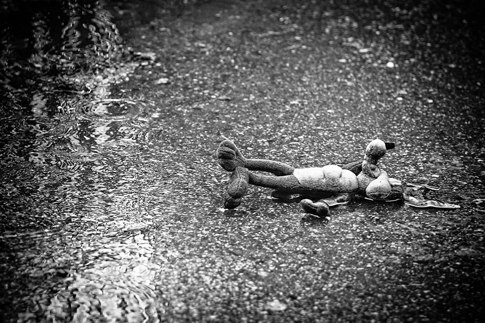 Prendendo atto delle indicazioni dei moderatori, passo a lasciare la mia impressione su questo scatto che, nella veste attuale, tende a porre la propria attenzione sul richiamo narrativo, derivante dall'associazione tra la pioggia ed il protagonista abbandonato dei giochi d'infanzia.