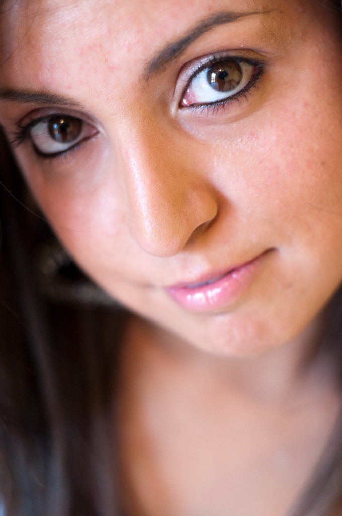 per me meglio la seconda versione, nella prima è troppo visibile che il fuoco è sul naso invece che sugli occhi. nei ritratti così stretti o la modella ha una pelle perfetta oppure conviene sempre una "lisciatina" che seppur leggera uniforma i toni della pelle e la rende meno problematica. Comunque bello il taglio e...peccato per la messa a fuoco.