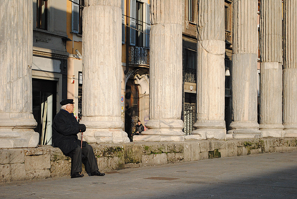 la prima quinta , seriale e ben composta , l' anziano seduto dal vestito scuro contrasta col colonnato