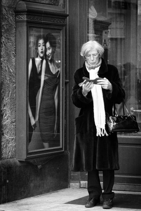 in questo caso le due modelle del cartellone guardano te, mentre la signora sta per i fatti suoi, a rigirarsi il guanto, non ci vedo Michele, un'azione coinvolgente e irripetibile, lo sguardo serioso della donna mi fa pensare che una sua occhiata verso di te, riusciva a rendere più particolare e interessante la ripresa.