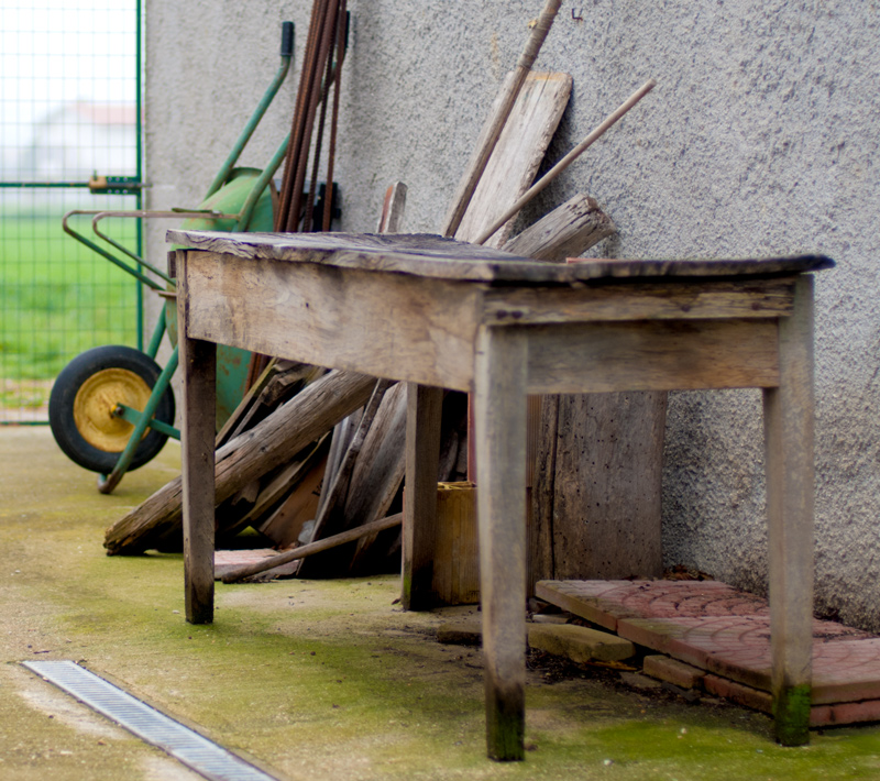 Concordo con i giudizi precedenti: vi sono diversi elementi che inteferiscono con il tavolo; alcuni sono di legno e sono però coerenti per quanto riguarda il materiale, altri sono completamente estranei come le sbarre di metallo e la carriola. Inoltre la parte di cancello fortemente illuminata distrae non poco l'attenzione (come tutte le parti fortemente illuminate) dal soggetto, indebolendolo.