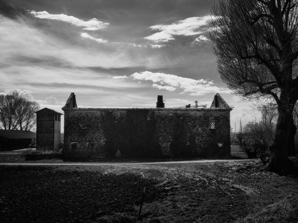 un'immagine ben composta ,ben bilanciata e dettagliata, un cielo interessante sopra questa vecchia abitazione diroccata con l'albero in primo piano che ne completa la composizione, l'unica stonatura è la gru che s'intravede sulla parte alta della costruzione,  |