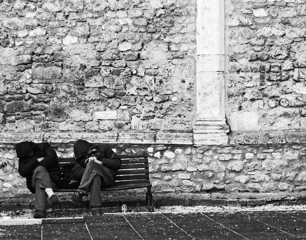 Per me niente male, l'inclinazione parallela dei sognatori sottolineata dall'ortogonalità delle linee del muro.