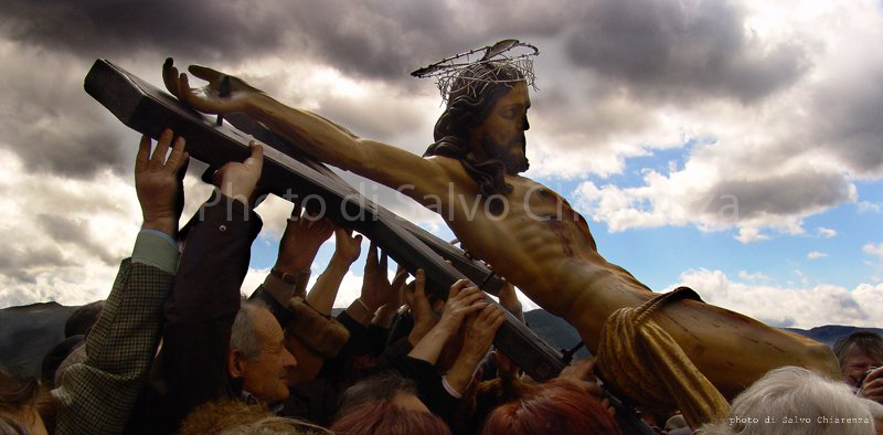Sicilia 2007 - il Crocifisso viene prelevato dalla sua cappella e condotto, facendosi largo tra la folla che si accalca per cercare di toccarlo e baciarlo, sul sagrato della chiesa, una ariosa "terrazza" che si apre verso i Monti Nebrodi.