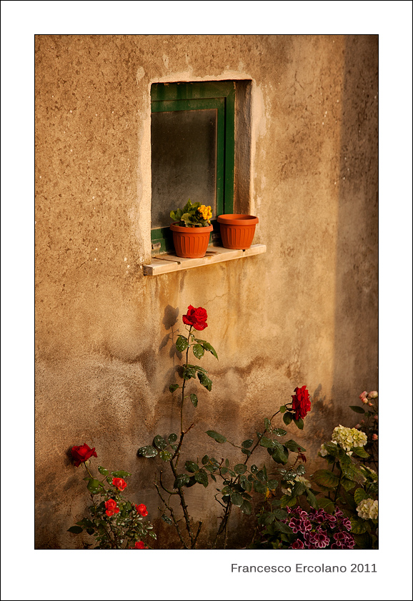 Rimango sempre molto colpito da fotografie come queste, che definisco delle piccole gemme. Non siamo di fronte a paesaggi mozzafiato di cime svettanti o di mari cristallini, nè ci si innalzano architetture frutto del genio umano. Nonostante questo mi emoziona questo quadretto domestico, questa semplice quotidianetà di campagna, di gerani piantati, di rose solitarie e di vasetti di plastica. Complimenti.