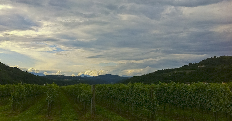 il vigneto allineato a sinistra avrebbe avuto senso se a destra non ci fossero state le montagne, ma essendo le montagne dello sfondo uniformemente distribuite, io avrei cercato la simmetria.